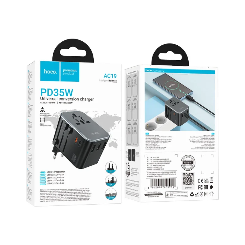 Le HOCO AC19 Supporter PD35W est un chargeur mural rapide et universel doté d’un port USB-C Power Delivery (PD 35W) et d’un port USB-A Quick Charge (QC 18W), permettant de recharger simultanément deux appareils avec une puissance totale maximale de 35 watts. Compatible avec la plupart des smartphones, tablettes et ordinateurs portables USB-C, il assure une charge rapide, stable et sécurisée grâce à ses technologies PD 3.0 et QC 3.0, ainsi qu’à ses protections intégrées contre la surtension, la surchauffe et le court-circuit. Son design compact, léger et résistant, fabriqué en ABS+PC ignifugé, le rend idéal pour une utilisation à la maison, au bureau ou en déplacement. Disponible en versions EU, US, UK et AU, le HOCO AC19 Supporter est le compagnon de charge parfait pour tous vos appareils, où que vous soyez