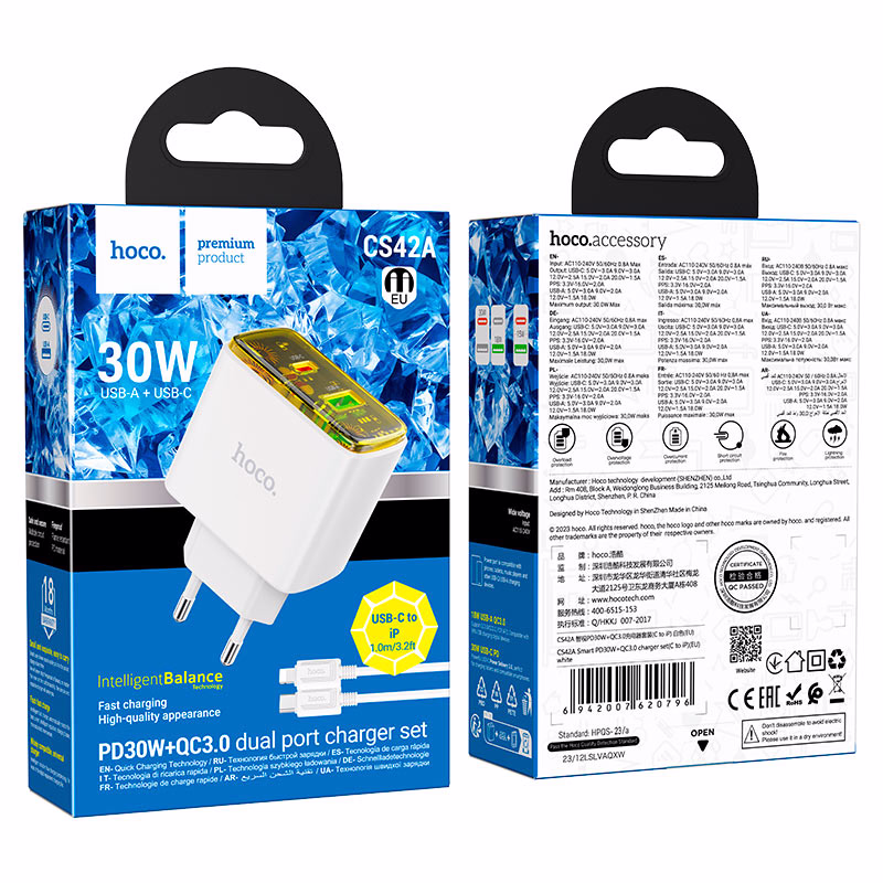 HOCO CS42A Smart PD 30W + QC3.0 charger set(C to iP)(EU) white (version EU) – Puissance rapide, design intelligent