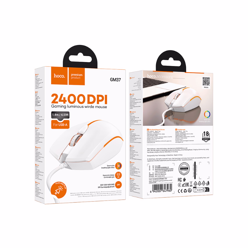 Optez pour la souris Hoco GM37 et améliorez votre expérience gaming avec précision, confort et style. Avec livraison rapide dans les 58 wilayas d’Algérie depuis hoco.dz, bénéficiez d’un produit original, au meilleur prix et en toute confiance. Transformez votre espace de jeu et dominez vos parties avec cette souris filaire lumineuse performante et durable.