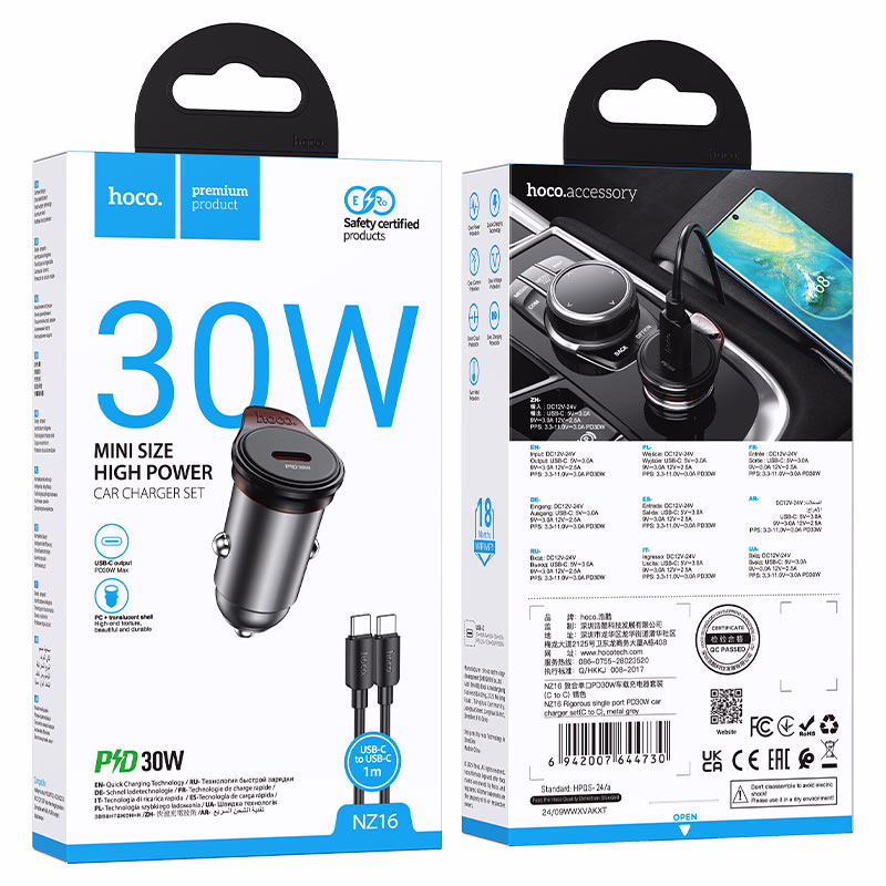 HOCO NZ16 Rigorous 30W prend en charge les protocoles de charge rapide PD3.0, PPS, QC3.0, AFC, FCP et SCP, garantissant une compatibilité parfaite avec les marques les plus populaires comme Samsung, Xiaomi, Huawei, Apple, Oppo et Realme. Son matériau en PC ignifugé assure une protection maximale contre la surchauffe, les surtensions et les courts-circuits, pour une sécurité totale sur la route.