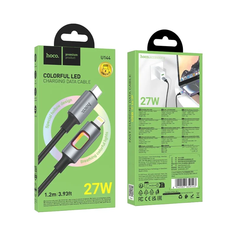 Le HOCO U144 se distingue par sa conception solide et ergonomique. Son câble de 1,2 mètre, tressé en nylon, résiste aux torsions, aux nœuds et à l’usure quotidienne, garantissant une longévité optimale. Les connecteurs en alliage d’aluminium renforcent la résistance aux chocs et améliorent la conductivité pour une charge rapide et stable. Le noyau interne, composé de fils de cuivre finement calibrés, assure une transmission efficace de l’énergie et des données tout en minimisant la perte et la surchauffe.