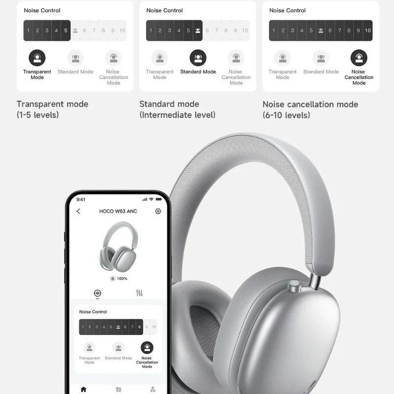 Équipé du Bluetooth 5.4 et de la puce JL7006F8, le HOCO W63 garantit une connexion stable, rapide et économe en énergie. Sa batterie de 500 mAh se recharge en seulement 1,5 heure et offre jusqu’à 55 heures d’autonomie, ou 38 heures avec l’ANC activé, idéal pour les longues journées en Algérie. Sa conception en ABS, cuir PU et maille en tissu assure robustesse et confort respirant. Léger (207 g) et parfaitement équilibré, il intègre une application dédiée pour un contrôle personnalisé ainsi que des alertes vocales en chinois et en anglais. Ce casque combine technologie, durabilité et qualité sonore pour répondre aux attentes des utilisateurs exigeants.