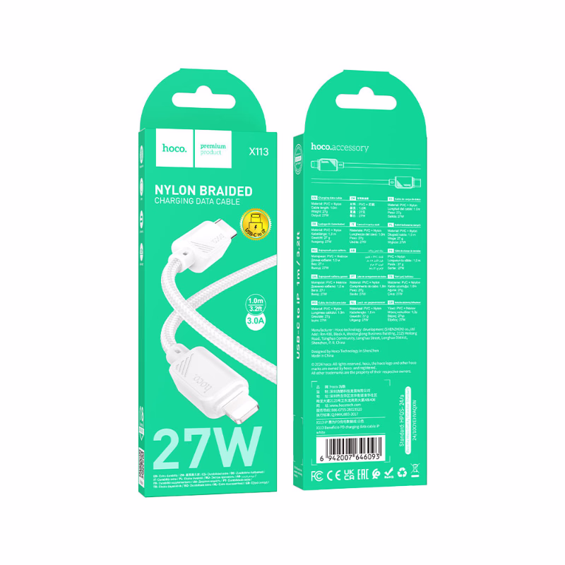 Sa gaine en nylon tressé protège efficacement contre les pliures et les frottements, tandis que le corps des connecteurs en PVC assure une excellente tenue dans le temps. Léger (27 g) et compact (1 mètre de longueur), il s’intègre facilement à tous vos déplacements. Le HOCO X113 Beneficio PD se distingue par sa qualité de fabrication supérieure, sa sécurité renforcée et son design ergonomique, le tout pensé pour les acheteurs en ligne algériens à la recherche d’un câble fiable et élégant.