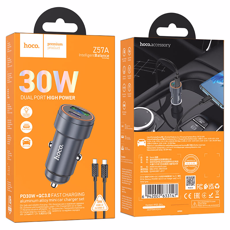 HOCO Z57A – Chargeur voiture rapide Glorious PD 30W + QC3.0 (C to C) – Double puissance, charge intelligente et design élégant
