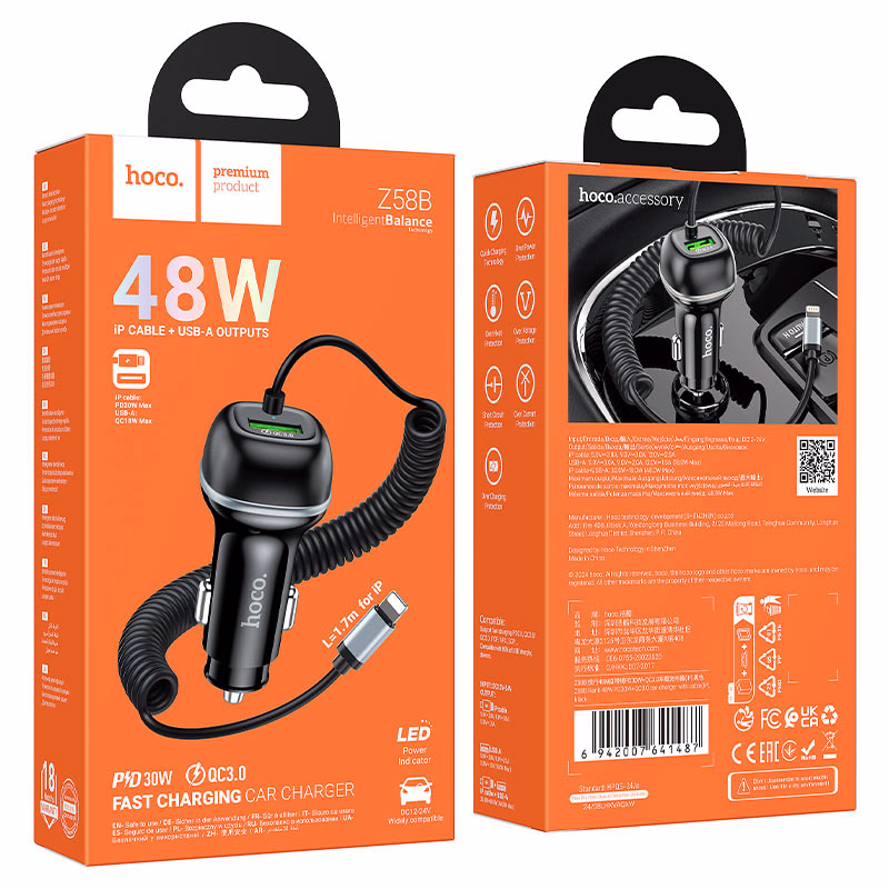 Conçu pour les véhicules 12–24 V, le Z58B délivre jusqu’à 48 W de puissance combinée, grâce à un câble intégré iPhone et un port USB-A compatibles avec les protocoles PD30W, QC3.0, AFC, FCP, SCP et plus encore. Son câble spiralé extensible de 1,7 m permet une utilisation fluide, que vous soyez conducteur ou passager. Fabriqué en polycarbonate ignifugé et alliage d’aluminium, il résiste à la chaleur et aux chocs tout en affichant une allure premium. Le voyant LED discret s’allume à la mise sous tension, ajoutant une touche moderne et fonctionnelle à votre intérieur. Léger (57 g), ergonomique et certifié pour la sécurité, le Z58B Rank 48W offre une charge stable, rapide et sûre pour vos smartphones, tablettes et accessoires. Il incarne la fiabilité, la durabilité et l’élégance technologique, parfaites pour la route.